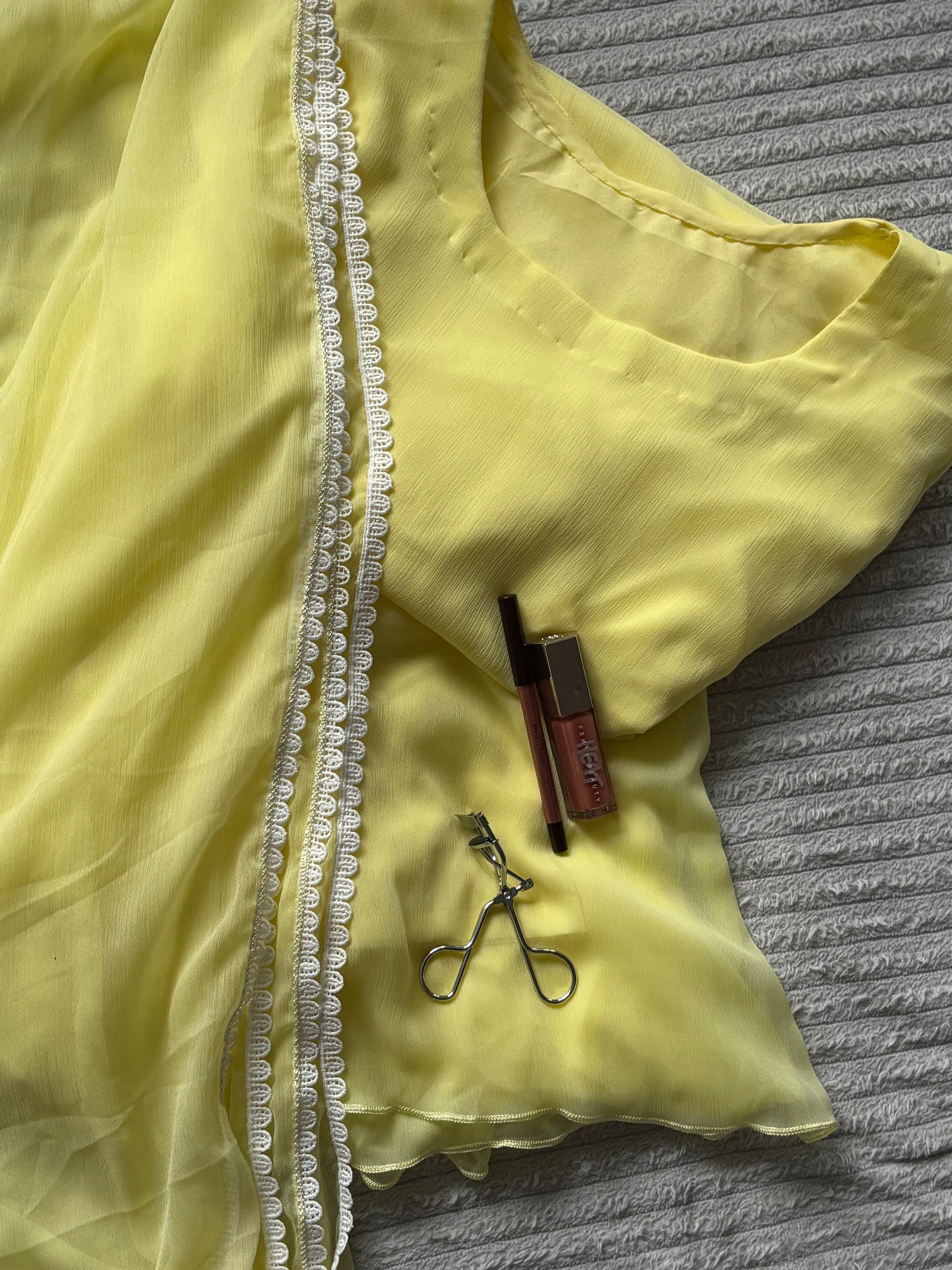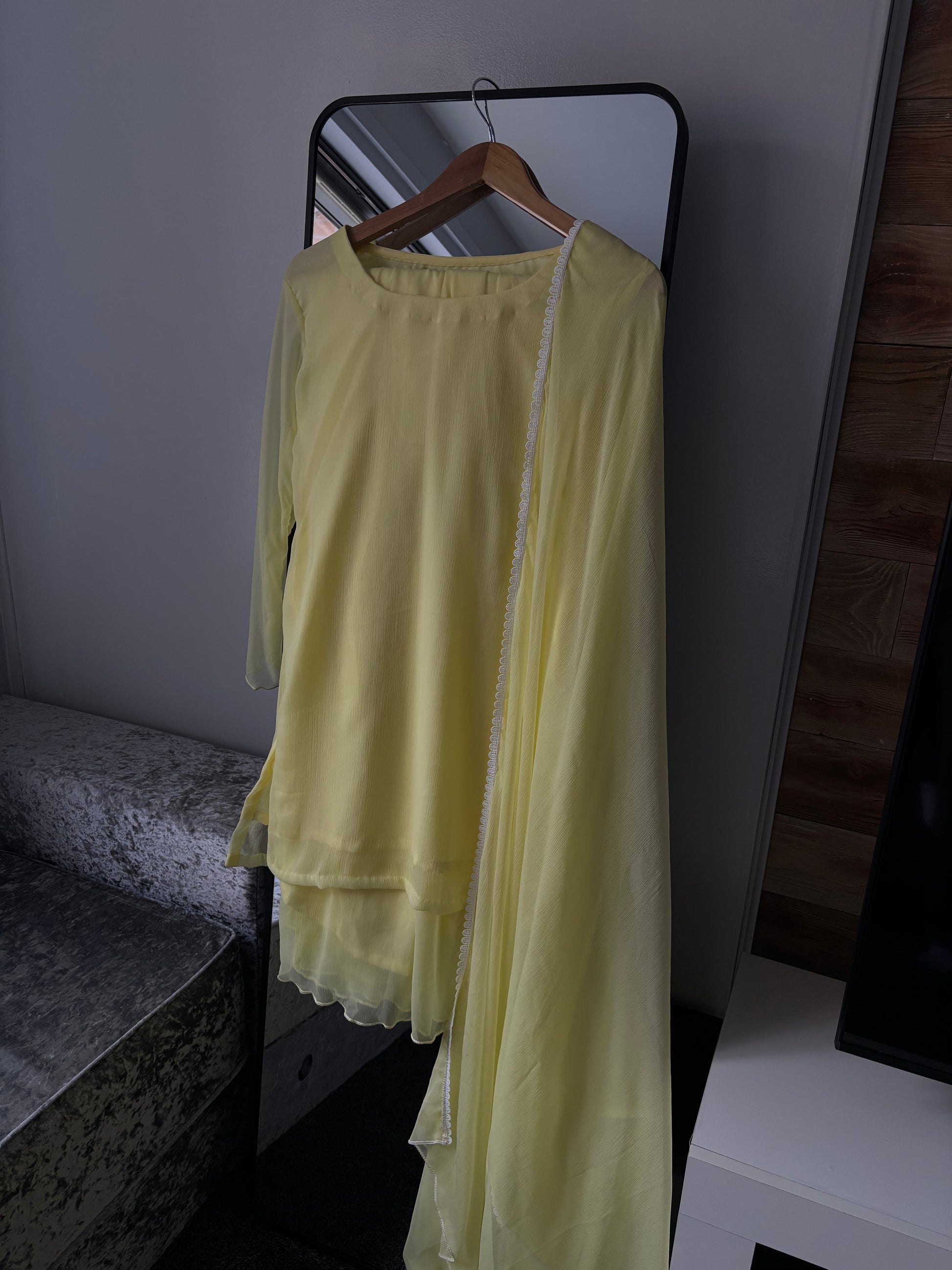 This butter yellow set is bright and perfect for any event. The scarf has a thin white lace around the edges, adding a delicate touch. It has bellbottom sleeves and wide sharara pants to match.