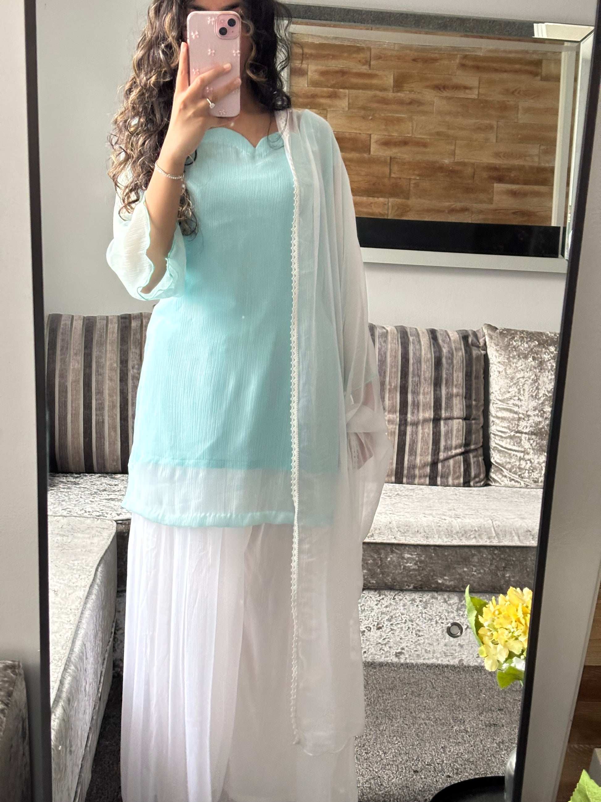 Look dreamy in this sky blue sharara set. The light blue top goes well with the white pants for a fresh look. The scarf has a simple white lace around it, making it special. It's a simple and stylish outfit that's perfect for summer.